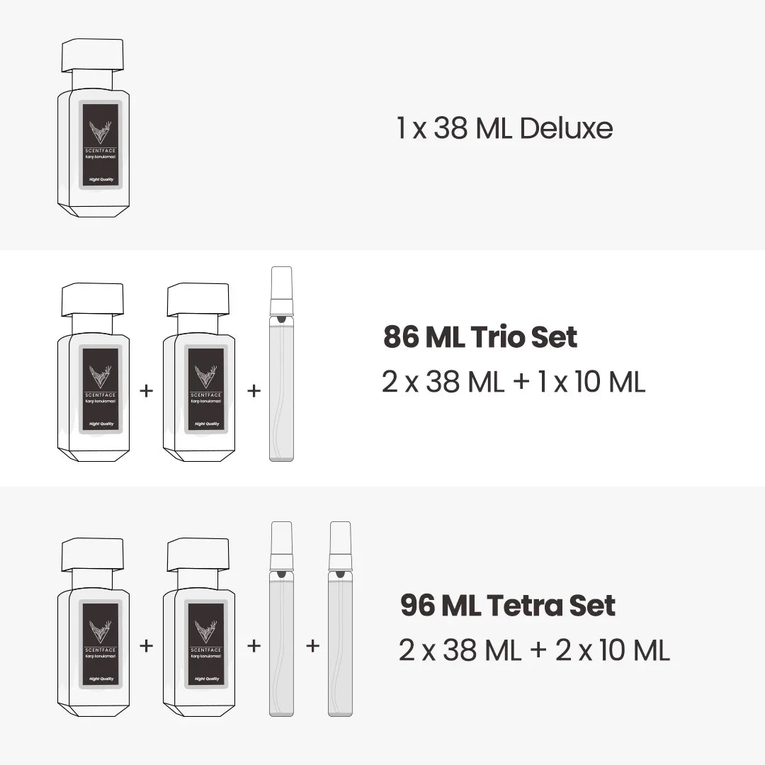 - Deluxe Kalite Standardı: 38 ml’lik özel Deluxe serimiz, en üst segment esanslarla Extrait de Parfum veya Parfum konsantrasyonunda, laboratuvar standartlarında ve uygun koşullarda formüle edilmiştir. Orijinal koku profiline %99 benzerlik sunarken; yine standart şartlarda ve uygun koşullarda gün boyu süren yüksek kalıcılık ve fark edilir bir yayılım (sillage) sağlar.
